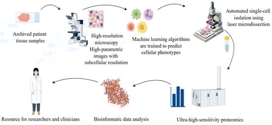 With the increasing popularity of AI, the combination of proteomics and artificial intelligence (AI) has opened new possibilities for biomedical research, disease diagnosis, and drug development in multiple fields. Proteomics studies generate such large and complex data, which AI, especially machine learning (ML) technology, can help parse [86]. The development of the AlphaFold database represents a major breakthrough of AI in proteomics [87]. It uses a deep learning algorithm to predict the 3D structure of proteins with much higher accuracy than previous prediction methods. Artificial intelligence in protein is the most important achievement; the Mann group of Rosenberger et al. [88] described a new technology called single-cell depth visual proteomics (scDVP) and how to use it from the cell slices of the mouse liver cell environment-dependent space proteome. They combined submicron-resolution imaging, artificial intelligence (AI)-based image-based single-cell phenotypic analysis and separation with ultrasensitive proteomics workflows to study protein abundance in single cells while retaining their spatial background (Figure 4). This approach enables researchers to link protein profiles to complex cellular phenotypes at the single-cell level and provide insights into cellular heterogeneity in diseases such as cancer.