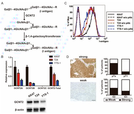Glucosaminyl (N-acetyl) transferase 2 (GCNT2) [6,7,8], a key enzyme for I-branched poly-lactosamine chain (I-antigen) synthesis, functions by transferring N-acetylglucosamine from UDP-N-acetylglucosamine to the galactose of a linear lactosamine chain (I-antigen) via the beta-1, 6-linkage (Figure 1A). The transition from antigen i to antigen I during human development increases the number of polylactosamine chains and functional terminal structures [9], such as sialyl-Lewis X and sialyl-Lewis A [10]. Branched polylactosamine chains enhance the binding affinity of some lectins [11]. Alpha-1,6-mannosylglycoprotein 6-beta-N-acetylglucosaminyltransferase-mediated branched polylactosamine chains promote prostate cancer cell invasion [12]. GCNT1-mediated core2 branching O-glycans promote testicular tumor invasion and prostate cancer aggressiveness [13,14]. We previously showed a strong correlation between GCNT2 expression and prostate cancer malignancy [15]. Additionally, we reported that core2 branching O-glycans are involved in the malignant transformation of bladder cancer by regulating tumor immunity [16]. Considering the crucial roles of GCNT2 in glycan branching, we hypothesized that it affects the tumor cell dynamics, particularly in bladder cancer, in which cell surface glycosylation patterns are critical for tumor proliferation and invasion. To verify this, we aimed to explore the associations between GCNT2 expression and clinical features of patients with bladder cancer in this study.