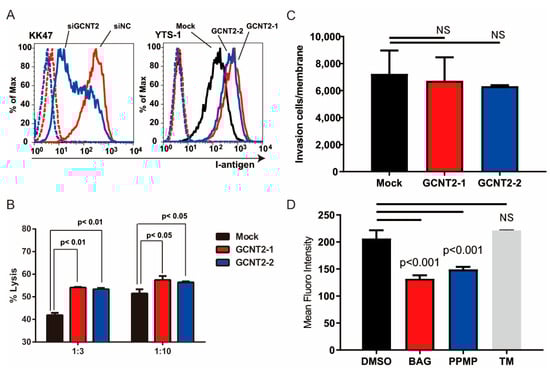 I-antigen regulates bladder cancer evasion from natural killer (NK) cells. (A) I-antigen expression was regulated by GCNT2. Dashed lines indicate the unstained control. (B) Cytotoxic effects of murine NK cells on YTS-1 and GCNT2-overexpressing YTS-1 (YTS1GCNT2-1 and 2) cells were assayed. (C) No significant differences in tumor cell invasion between YTS-1 and GCNT2-overexpressed YTS-1. (D) YTS-1 cells were cultured with the O-glycosylation inhibitor benzyl-alph-GalNAc (BAG), glucosylceramide synthetase inhibitor DL-threo-1-Phenyl-2-palmitoylamino-3-morpholino-1-propanol hydrochloride (PPMP), and N-glycosylation inhibitor tunycamycin (TM) for 48 h. I-antigen expression was determined by flow cytometry. BAG- and PPMP-treated cells showed a significant reduction in I-antigen levels. NS = not significant.