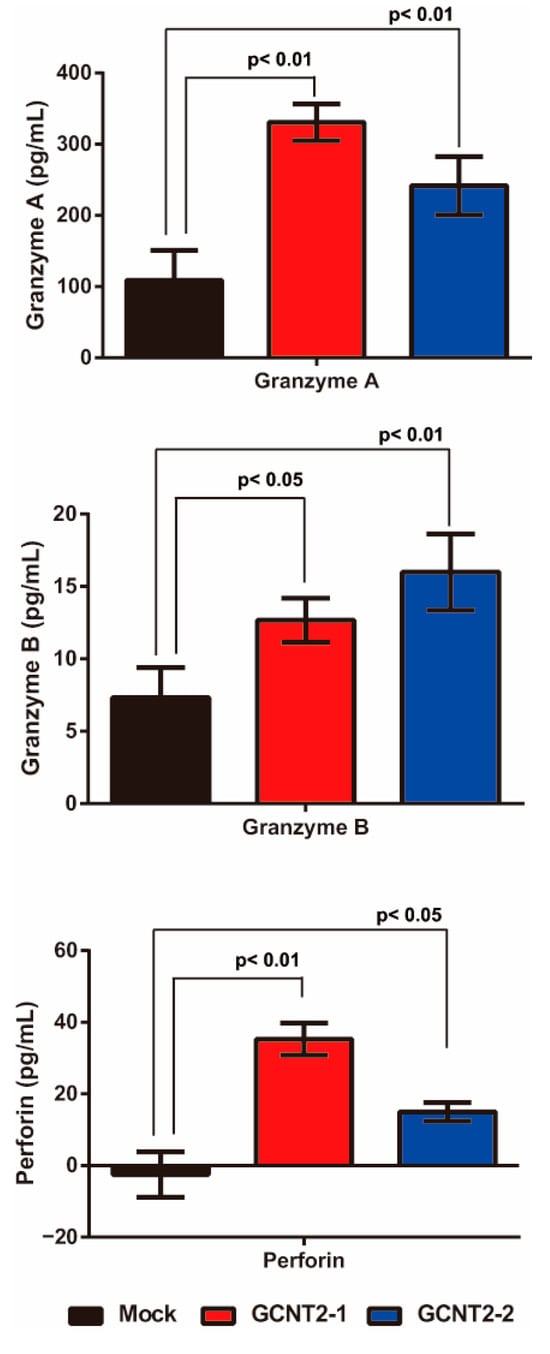 NK cells are activated via interactions with target cells and subsequently release granule-containing substances to induce target cell death. These granular molecules include granzyme A, granzyme B, and perforin, which trigger apoptosis in the target cells. First, we confirmed whether I-branching glycans suppress NK cell–tumor cell interactions. The NK cell-tumor cell conjugation assay revealed no significant differences in YTS-1 and YTS1-GCNT2 (Supplementary Figure S3). Next, we evaluated the release of these molecules via NK cell–bladder cancer cell interactions by analyzing the co-culture supernatant via enzyme-linked immunosorbent assay. YTS-1 cells with high GCNT2 levels exhibited significantly greater secretion of granzyme A, granzyme B, and perforin than those with normal GCNT2 levels (Figure 3). These observations suggest that low I-antigen levels reduce the interactions between NK and bladder cancer cells, thereby suppressing the release of granzyme A, granzyme B, and perforin.