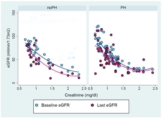 An inverse non-linear and graded association between the baseline serum creatinine levels and the probability of change in estimated GFR was demonstrated in PH patients, contrary to those without PH, for whom this relationship was linear and constant.