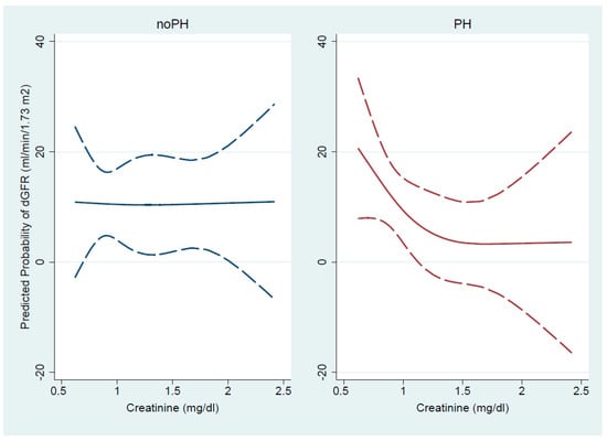 Cubic spline transformation was applied to investigate the possible non-linear relationship between bCr and deGFR. In the no-PH group, it was observed that the predicted probability of change in GFR magnitude was linear and constant over the entire bCr range, whereas in the PH group, deGFR decreased progressively with creatinine increment, in a J-shaped curve. The predicted mean of deGFR probability enabled the detection of a change in the spline’s slope, which became steeper for patients with bCr levels below 1.5 mg/dL (Figure 2).