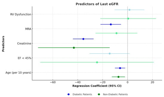 The results, as illustrated in Figure 3, identify significant predictors and highlight differences between diabetic and non-diabetic subgroups. For patients with diabetes, age, baseline creatinine levels, and the use of MRA were found to be significant predictors of renal function. However, LVEF < 45% and RV dysfunction did not achieve statistical significance. In contrast, for non-diabetic patients, the significant predictors were age and baseline creatinine, whereas MRA, EF < 45%, and RV dysfunction did not demonstrate statistical significance. The models explained 71% of the variance in renal function outcomes for diabetic patients, compared to 52% for non-diabetic patients.