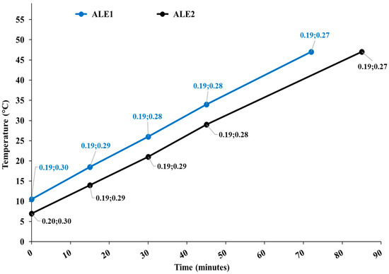Temperature diagram as a function of the process time for extraction runs ALE1 and ALE2. Data tags show the levels of the cavitation number in the static HC reactor and at the pump impeller.