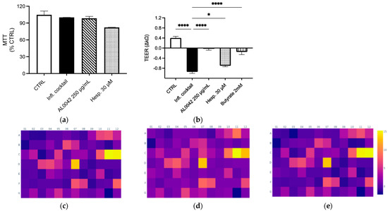 Evaluation of the effect of spray-dried extract and hesperidin on (a) Cytotoxicity; (b) Epithelial integrity. These measurements were performed in triplicate, and the error bars represent the standard error of the mean. Upregulation of genes after treatment with the inflammatory cocktail: (c) Control; (d) AL0042; (e) Hesperidin. Caco-2 cells, as enterocytes, were exposed to inflammatory cocktail (TNF-α 50 ng/mL, INF-γ 50 ng/mL, IL-1β 25 ng/mL, and LPS 1 mg/mL) and spray-dried extract at 250 μg/mL (AL0042) or pure molecule hesperidin at 30 μM (Hesp.) for 24 h. The cell viability was assessed using MTT test (a), where data were expressed as % of viability in respect to the stimulated condition. The epithelial integrity was assessed with the measurement of TEER (b), where data were expressed as variation in TEER values (∆Ω = Ωt24 h − Ωt0), * p < 0.05, **** p < 0.0001 vs. inflammatory cocktail. The impact on selected inflammatory genes was assessed with RT-PCR (c–e). The modulation (fold change) of the inflammatory cocktail on inflammatory genes was represented in the heatmap (c), while the impact (fold change) of the spray-dried extract and hesperidin on inflammatory genes was represented in the heatmaps (d and e, respectively), all relative to the unstimulated control.