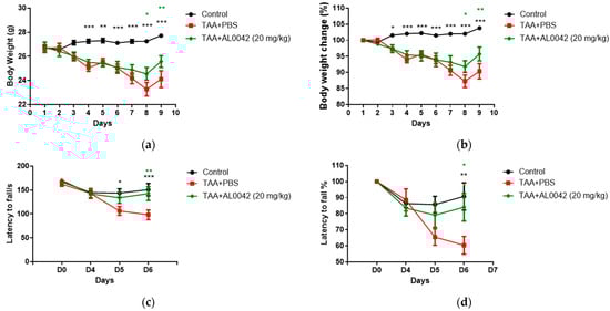 Body weight and abnormal behavior in control, TAA-induced, and TAA + AL0042-treated mice: (a) Time change of body weight with time; (b) Percentage time change of body weight with time; (c) Time change of latency to fall with time; (d) Percentage time change of latency to fall with time. C57BL/6 male mice were intraperitoneally treated daily with thioacetamide for a week. From day 1 to 7, AL0042 was administered by oral route at 20 mg/kg (n = 10). Body weight was registered daily, and the results were expressed as the mean of measurements performed in triplicate ± SE, * p < 0.05, ** p < 0.01, *** p < 0.001, were reported in green (AL0042 versus TAA-PBS) or black (control versus TAA-PBS), vs. TAA-PBS group, two-way ANOVA.