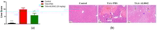 Activity of AL0042 on liver morphology and inflammation: (a) Liver score, with measurements performed in triplicate, and the error bars representing the standard error of the mean; (b) Hepatocyte morphological alteration. The samples were photographed under a light microscope using a 20× objective lens. An image of each slice was captured. **** p < 0.0001 versus TAA + PBS, * p < 0.05 versus TAA + PBS, ^^ p < 0.01 versus control. General score system for MHE staining: green arrow indicates congestion, red arrow indicates inflammation, blue arrow indicates necrosis, yellow arrow indicates vacuolization.