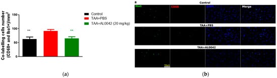 Brain inflammation markers: (a) IBA1/CD68 co-labelling cells number, with measurements performed in triplicate, and the error bars representing the standard error of the mean; ** p < 0.01 versus TAA + PBS were reported in green (TAA + AL0042) or black (control); (b) The samples were examined under a fluorescence microscope using the same magnification of image (40×). The quantification of cell numbers was performed by Image J.4. Three images of each slice were captured. IBA1/CD68 co-labelling cells numbers were counted by Image J.4, and the cells numbers were analyzed by normalizing per field, the area of which is 0.066 mm2; then, we averaged the data.