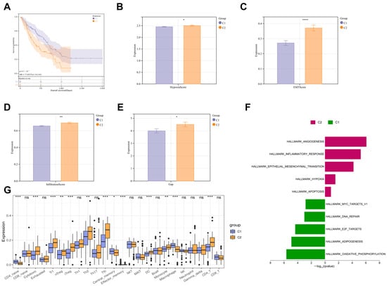 Clustering analysis based on cold-exposure-related genes (CERG). Consensus clustering of IPF patients from the GSE70866 dataset was performed based on the expression levels of CERG, resulting in the classification of IPF patients into two clusters: Cluster 1 (C1, 95 samples) and Cluster 2 (C2, 81 samples). (A) Kaplan–Meier (K-M) survival curves for the two clusters. (B–E) IPF-related characteristic scores for the two clusters. (F) GSVA analysis of the two clusters. (G) Immune cell infiltration profiles of the two clusters. ns p > 0.05, * p < 0.05, ** p < 0.01, *** p < 0.001, **** p < 0.0001.