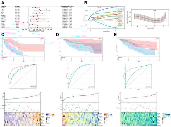 Construction and validation of a prognostic model for IPF. (A) Univariate Cox risk analysis of 35 cold-exposure-related differentially expressed genes in the Freiburg cohort identified 14 genes with prognostic significance. (B) Construction of a prognostic model using Lasso–Cox regression analysis. (C–E) Validation of the prognostic model, including K-M survival curves, ROC curves, and prognostic heatmaps. (C) Freiburg cohort, (D) SIENA cohort, and (E) LEUVEN cohort.