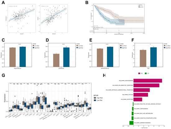 Characteristics of high-risk and low-risk IPF patient groups. (A) Correlation between RiskScore and Hypoxia/EMT scores. (B) IPF patients were divided into a high-risk group (88 samples) and a low-risk group (88 samples) based on the median RiskScore. K-M survival curves for the high-risk and low-risk groups are shown. (C–F) Scores for IPF-related characteristics in the high-risk and low-risk groups. (G) Immune cell infiltration in the high-risk and low-risk groups. (H) GSVA for the high-risk and low-risk groups. ns p > 0.05, * p < 0.05, ** p < 0.01, *** p < 0.001, **** p < 0.0001.
