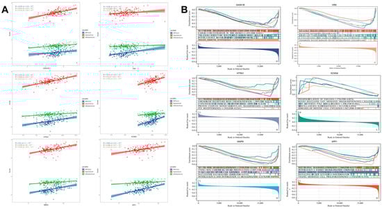 Correlation analysis and GSEA analysis of signature genes with IPF characteristic scores. (A) The six signature genes exhibit positive correlations with hypoxia score, EMT score, and immune score. (B) Single-gene GSEA analysis of the six genes.
