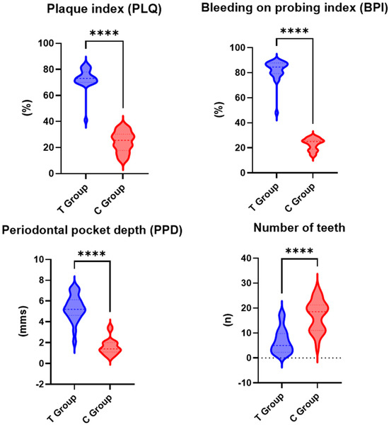 Periodontal parameters for test group (T) and control group (C); ****—p < 0.001.