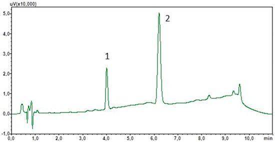For chromatographic analysis, a Nexera XR UHPLC liquid chromatograph (Shimadzu, Kyoto, Japan) consisting of an LC-30AD pump, CTO-20AC thermostat, SIL-30AC autosampler, SPD-M30A UV-VIS detector with diode array, and SPD-M30A high-sensitivity measuring cell (85 mm), controlled by a CBM-20 Alite control system, was used. Chromatographic separation was carried out using a Eurospher II 100-3 column (C18, 50 × 4.6 mm, 3 µm; Knauer, Berlin, Germany) with precolumn maintained at 35 °C. Acetonitrile and water constituted the mobile phase at a flow rate of 0.9 mL/min, with a linear gradient with an initial acetonitrile concentration of 25% and a final concentration of 90%, which increased until 9 min. Afterwards, the acetonitrile content decreased to the initial value within 2 min. The total analysis time including column equilibration was 11 min.