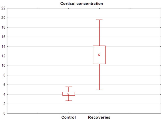 Statistical evaluation of the results obtained was performed using Statistica (13.3). Statistically significant differences in cortisol concentrations between the different groups were determined using the Wilcoxon test, and the significance level was set at p < 0.05.