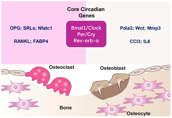 Circadian regulation of bone remodeling. Bone remodeling is a continuous process driven by the balanced activity of osteoclasts, responsible for bone resorption, and osteoblasts, which facilitate new bone formation. Maintaining this equilibrium is crucial for preserving skeletal health. Osteoclasts degrade the bone matrix, releasing minerals into circulation, while osteoblasts synthesize and mineralize new bone tissue. Core genes of the circadian clock are fundamental in controlling bone remodeling. The Bmal1/Clock complex initiates the expression of circadian-regulated genes, while Per/Cry and Rev-erb-α function as suppressors, creating rhythmic gene expression patterns that impact osteoclast and osteoblast activity. In osteoclasts, circadian genes influence bone resorption by controlling essential regulators, including osteoprotegerin (OPG), sclerostin (SRTs), Nfatc1, RANKL, and FABP4. In osteoblasts, circadian control influences bone formation through pathways involving protein disulfide isomerase family A member 3 (Pdia3), Wnt signaling, matrix metalloproteinase-3 (Mmp3), chemokine (C-C motif) ligand 3 (CCl3), and interleukin-6 (IL6). These molecular interactions underscore the critical influence of circadian rhythms in maintaining skeletal balance.
