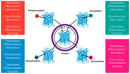Regulation of bone remodeling through protein modifications. Bone remodeling is a highly controlled process that relies on the coordinated actions of osteoblasts, chondrocytes, and osteoclasts to regulate bone formation, cartilage maturation, and resorption. Protein modifications after translation are essential for regulating the stability, activity, and function of key signaling molecules throughout this process. This study focuses on four major protein modifications—phosphorylation, acetylation, ubiquitination, and sumoylation—in bone remodeling. These PTMs collectively orchestrate the cellular processes necessary for maintaining bone homeostasis and skeletal integrity.