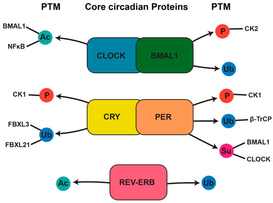 PTMs are chemical changes that proteins undergo after synthesis, playing a crucial role in regulating their structure, stability, localization, and function [37,38,39,40]. These modifications allow for rapid and reversible changes, enabling proteins to respond dynamically to cellular and environmental cues [41,42]. Within the circadian clock system, PTMs play a vital role in ensuring rhythmic accuracy and stability, regulating both clock protein function and associated downstream pathways [18].