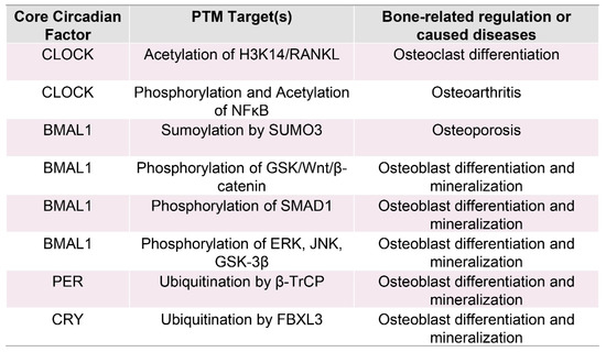 Core circadian factors, posttranslational modifications, and their roles in bone remodeling. This table presents the key circadian regulators—CLOCK, BMAL1, PER, and CRY—and their interactions with PTM-associated proteins. These alterations are essential for controlling bone remodeling and have been linked to various bone disorders. CLOCK promotes osteoclast differentiation through the acetylation of H3K14 and regulation of RANKL and contributes to osteoarthritis via phosphorylation and acetylation of NF-κB. BMAL1 regulates bone formation through various mechanisms, such as SUMO3-mediated sumoylation (associated with reduced bone mass) and phosphorylation processes that impact GSK/Wnt/β-catenin, SMAD1, ERK, JNK, and GSK-3β, all of which influence osteoblast development and bone mineralization. PER contributes to osteoblast development and mineralization through β-TrCP-mediated ubiquitination, whereas CRY influences these processes via FBXL3-driven ubiquitination. These findings underscore the complex interplay between circadian regulation, PTMs, and skeletal homeostasis, highlighting potential therapeutic targets for bone-related disorders.