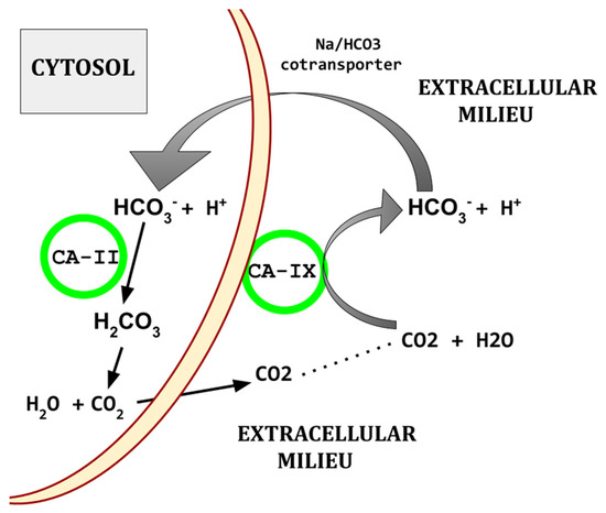 Elevated CA isoforms are characteristic of UBC tissues [127]. CA-II and -IX regulate the pH of the UBC tumor microenvironment and are overexpressed in UBC. As illustrated in Figure 2, CA-II and CA-IX, working together, limit the lowering of intracellular pH that would otherwise result from the UBC hypermetabolic state.