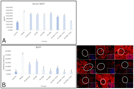 (A) A histogram of serum BAFF levels in the study groups. p < 0.05 was found in control vs. model; model vs. PA 1500 + prednisone; and model vs. PA 2500 + prednisone groups. (B) A histogram of kidney BAFF expression in the study groups. p < 0.05 found in control vs. model; control vs. prednisone; control vs. PA 500; control vs. PA 1500; model vs. prednisone; model vs. PA 500; model vs. PA 1500; model vs. PA 2500; model vs. PA 500 + pred; model vs. PA 1500 + prednisone; and model vs. PA 2500 + prednisone groups; prednisone vs. PA 2500; prednisone vs. PA 1500 + prednisone; prednisone vs. PA 2500 + prednisone. The expression of BAFF in kidneys is shown in Figure (a–i). BAFF immunofluorescence in kidneys at 400× magnification. (a) Negative control; (b) nephrotic syndrome model; (c) prednisone; (d) Physalis angulata at a dose of 500 mg/kgBW; (e) Physalis angulata at a dose of 1500 mg/kgBW; (f) Physalis angulata at a dose of 2500 mg/kgBW; (g) Physalis angulata at a dose of 500 mg/kgBW + prednisone; (h) Physalis angulata at a dose of 1500 mg/kgBW + prednisone; (i) Physalis angulata at a dose of 2500 mg/kgBW + prednisone. White circles indicate BAFF expression in the glomerulus. The image in the lower right corner represents a composite view of the antibody and DAPI.
