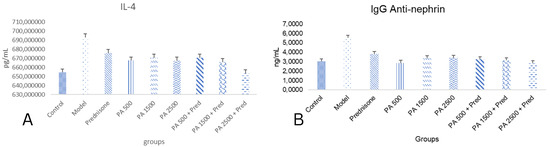 (A) A histogram of kidney IL-4 (pg/mL tissue) and anti-nephrin IgG levels in the study groups. p < 0.05 was found in control vs. model; control vs. prednisone; model vs. PA 500; model vs. PA 1500; model vs. PA 2500; model vs. + PA 500 + prednisone; model vs. PA 2500 + prednisone groups. (B) A histogram of serum IgG anti-nephrin levels in the study groups. p < 0.05 found in control vs. model; model vs. PA 500; model vs. PA 1500; model vs. PA 2500; model vs. PA 500 + prednisone; model vs. PA 1500+ prednisone; model vs. PA 2500 + prednisone groups.