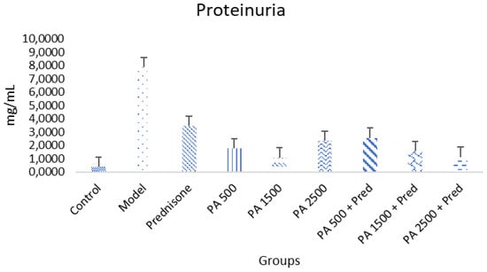 A histogram of serum proteinuria in the study groups. p < 0.05 was found in control vs. model; control vs. prednisone; control vs. PA 500; control vs. PA 1500; control vs. PA 2500; control vs. PA 500 + prednisone; control vs. PA 1500 + prednisone; control vs. PA 1500 + prednisone; model vs. prednisone; model vs. PA 500; model vs. PA 1500; model vs. PA 2500; model vs. PA 500 + prednisone; model vs. PA 1500+ prednisone; model vs. PA 2500 + prednisone groups.