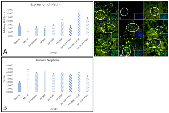 The expression of nephrin in kidneys is shown in Figure (a–i). Nephrin immunofluorescence in kidneys at 400× magnification. (a) Negative control; (b) nephrotic syndrome model; (c) prednisone; (d) Physalis angulata at a dose of 500 mg/kgBW; (e) Physalis angulata at a dose of 1500 mg/kgBW; (f) Physalis angulata at a dose of 2500 mg/kgBW; (g) Physalis angulata at a dose of 500 mg/kgBW + prednisone; (h) Physalis angulata at a dose of 1500 mg/kgBW + prednisone; (i) Physalis angulata at a dose of 2500 mg/kgBW + prednisone. White circles indicate nephrin expression in the glomerulus. The image in the lower right corner represents a composite view of the antibody and DAPI. (A) A histogram of nephrin expression in the study groups. A histogram of nephrin levels in the study groups. p < 0.05 was found in control vs. model; control vs. PA 1500 + prednisone; model vs. PA 1500; model vs. PA 2500; model vs. PA 500 + prednisone model vs. PA 1500 + prednisone; and model vs. PA 2500 + prednisone groups. (B) A histogram of urinary nephrin levels in the study groups. p < 0.05 was found in control vs. model; control vs. prednisone; control vs. PA 500; control vs. PA 1500; control vs. PA 2500; control vs. PA 500 + prednisone; control vs. PA 1500 + prednisone; model vs. prednisone; PA 500; model vs. PA 1500; model vs. PA 2500; model vs. PA 500 + prednisone; model vs. PA 1500 + prednisone; and model vs. PA 2500 + prednisone groups.