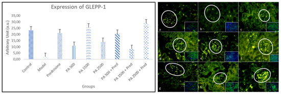 The expression of GLEPP-1 in kidneys is shown in Figure (a–i). GLEPP-1 immunofluorescence in kidneys at 400× magnification. (a) Negative control; (b) nephrotic syndrome model; (c) prednisone; (d) Physalis angulata at a dose of 500 mg/kgBW; (e) Physalis angulata at a dose of 1500 mg/kgBW; (f) Physalis angulata at a dose of 2500 mg/kgBW; (g) Physalis angulata at a dose of 500 mg/kgBW + prednisone; (h) Physalis angulata at a dose of 1500 mg/kgBW + prednisone; (i) Physalis angulata at a dose of 2500 mg/kgBW + prednisone. White circles indicate nephrin expression in the glomerulus. The image in the lower right corner represents a composite view of the antibody and DAPI. The histogram of GLEPP-1 expression in the study groups. p < 0.05 was found in control vs. model; control vs. PA 1500 + prednisone; model vs. prednisone; model vs. PA 500; model vs. PA 1500; model vs. PA 2500; model vs. PA 500 + prednisone; model vs. PA 1500 + prednisone; and model vs. PA 2500 + prednisone groups.
