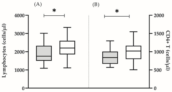 Absolute count of lymphocytes (A) and CD4+ T cells (B) in the test group (grey bars) and in the control group (white bars). The boxplot bar represents median (min–max) (* p < 0.05).