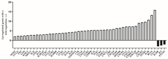 Differentially expressed genes with a fold regulation more than 2 (up-regulated) or less than −2 (down-regulated) in the group of individuals with premature immunosenescence (test group).