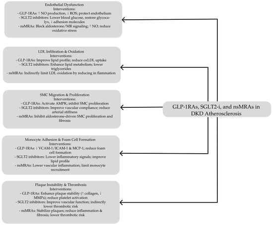 Nowadays, current treatments for DKD primarily target risk factors such as hyperglycemia, hypertension, and dyslipidemia. However, these interventions fail to address the underlying molecular mechanisms driving DKD and its associated atherosclerotic complications []. This limitation underscores the pressing need for innovative therapeutic approaches for early intervention to prevent irreversible kidney damage and strategies that target fundamental pathophysiological processes underlying atherosclerosis in DKD This review discusses the role of GLP-1 receptor agonists (GLP-1 RAs), sodium–glucose cotransporter 2 (SGLT2) inhibitors, and nonsteroidal mineralocorticoid receptor antagonists (nsMRAs) in the generation and progression of atherosclerosis through their effects on endothelial function, vascular inflammation, lipid metabolism, oxidative stress, and plaque stability. In addition, it evaluates their role in reducing cardiovascular risk, including the prevention of major adverse cardiovascular events (MACEs), supported by findings from both preclinical models and clinical trials. By integrating mechanistic insights with therapeutic outcomes, this review comprehensively explains how these emerging antidiabetic agents contribute to vascular protection and atherosclerotic disease modification.