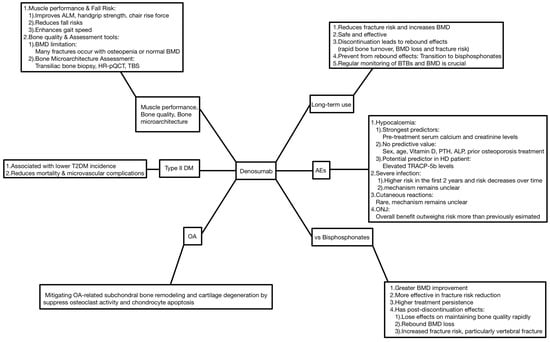 Despite these limitations, our findings provide valuable guidance for clinical decision-making regarding denosumab therapy. The results suggest that several patient populations may particularly benefit from denosumab treatment: patients requiring long-term osteoporosis management (minimum 3 years) because of its demonstrated efficacy in reducing fractures and increasing BMD; frail elderly patients or those with poor BMD and higher fracture incidences who may respond better to denosumab than bisphosphonates; individuals seeking improvements in functional capacity, as evidenced by enhanced handgrip strength, walking speed, and reduced fall rates compared to bisphosphonate therapy; patients at an elevated risk for T2DM, given the potential role of denosumab in reducing T2DM incidence through inflammation mitigation and improved insulin sensitivity; and patients with OA, given the possible mechanism of denosumab in suppressing osteoclast activity and chondrocyte apoptosis. Conversely, certain patient populations warrant careful consideration or may be unsuitable for denosumab therapy: those at risk for hypocalcemia or with kidney dysfunction require vigilant monitoring of serum calcium and creatinine levels; immunocompromised patients or those prone to infections, particularly during the initial two years of treatment when the infection risk is greater; individuals with pre-existing skin conditions or susceptibility to cutaneous reactions; and patients with oral health issues or an increased risk for ONJ. These insights emphasize the importance of personalized medical approaches in osteoporosis management, in which careful patient selection and monitoring are crucial for optimizing treatment outcomes and minimizing AEs.