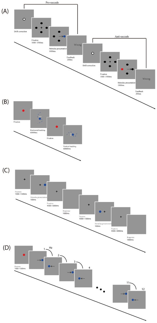 Pro- and anti-saccades task: A drift correction procedure was performed before each trial. Participants were asked to look at a fixation dot at the center of a screen on a gray background and press the space bar to start. A black fixation cross (+; 1° × 1° of visual angle) was initially presented at the screen center, and four black circles (diameter: 0.5° of visual angle) were displayed at ±9.7° horizontally and vertically away from the screen center at the same time. Firstly, participants were required to fixate the cross (which lasted between 1000 and 1500 ms). Then, in each trial, one of the black circles turned blue or red randomly. In the pro-saccade task, participants were required to look at the target (which is the blue circle). In the anti-saccade task, participants were required to look at the opposite position to the target (which is the red circle). For trials that timed out (participant failed to look to the color-changed circle 1000 ms after target onset) and for trials in which participants made an initial saccade to the wrong position, participants received visual (“wrong”) feedback which lasted 200 ms. Each participant first finished 16 practice trials including 2 times for each direction for pro-and anti-saccade conditions and then started the formal experiment, which was performed 8 times during 2 blocks for pro- and anti-saccade tasks each, with a total number of 64 trials (see