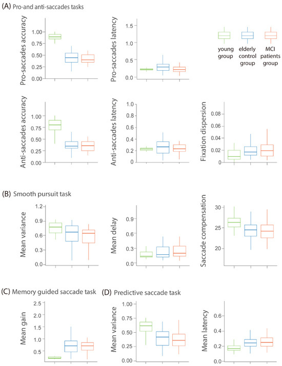 46]. Meanwhile, this sensitivity of eye movement metrics to subtle cognitive changes, especially in MCI patients, is supported by evidence showing that tasks like the anti-saccades paradigm can effectively differentiate MCI patients from healthy controls [