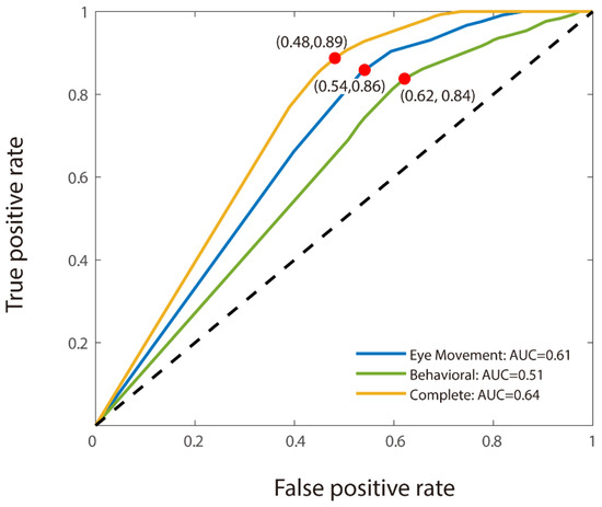 Table 3). The model using only eye movement features also achieved a better result (AUC: 0.61) than the behavioral features-only model (AUC: 0.51). Moreover, the combined features model achieved the best AUC at 0.64 (see