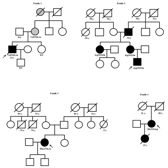Pedigrees of families with PRKAG2 variants. Legend: squares denote males, circles for females; numbers denote age at death in years, black color—affected, grey color—borderline/uncertain phenotype; subjects tested genetically are marked either by the name of the heterozygous PRKAG2 variant or as “WT”, if negative for PRKAG2 variant detected in the proband.