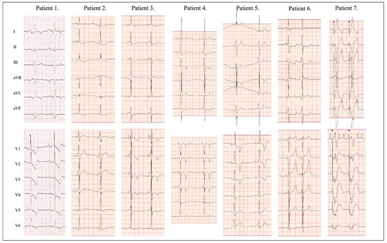 12-lead standard electrocardiogram in 7 patients with PRKAG2 variants. Patient 1: Sinus rhythm 68 bpm, normal QRS axis of −27°, PR 194ms, QRS 150 ms, RBBB, left ventricular and right ventricular hypertrophy, biatrial enlargement, ST depression and T-wave inversions in I, aVL and V1-6 secondary to RBBB and biventricular hypertrophy. Patient 2: Sinus rhythm 62 bpm, normal QRS axis of 68°, short PR interval of 120 ms, notched QRS of 110 ms in III, aVF, V1, narrow q waves in leads V5–V6. Right ventricular hypertrophy, ST depression in II, III, aVF. Patient 3: Sinus rhythm 64 bpm, normal QRS axis of −3°, short PR interval of 113 ms, QRS 128 ms, preexcitation pattern. Patient 4: Sinus bradycardia 43 bpm, normal QRS axis of −8°, PR 127 ms, QRS 146 ms, interventricular conduction delay (LBBB-like pattern), LVH and profound repolarization abnormalities (negative deep T waves in II, III, aVF and V1–V4). Patient 5: Sinus bradycardia 46 bpm, left axis deviation of −45°, PR 150 ms, QRS 130 ms, RBBB, LAFB, left atrial enlargement, LVH, RVH. Patient 6: Sinus rhythm 60 bpm, left axis deviation of −46°, PR 140 ms, QRS 135 ms. rSR’ in V1. LVH with intraventricular conduction delay and secondary ST-T abnormalities. Biatrial enlargement. Narrow q waves in leads I, aVL, V6. Patient 7: Atypical atrial flutter 220 ms, VVI pacing 75 bpm. Shortcuts explained in the Table 2 legend.
