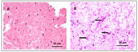 Endomyocardial bioptate images. (A) Hypertrophied cardiomyocytes with enlarged pleomorphic nuclei, HE ×200. (B) Periodic acid–Schiff–positive deposits corresponding to glycogen in cardiomyocytes (arrows), PAS ×200.