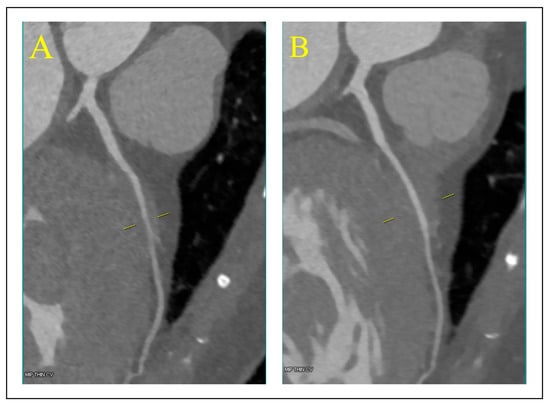 Coronary computed tomography angiography. Image of left anterior descending artery (LAD) in systole (A) and diastole (B). On the left side of the respective images coronary artery cross sections illustrating the depth of the intramuscular course of the mid arterial segment. Notably, the mid LAD within the myocardial muscle displays signs of compression with dynamic stenosis during the systolic phase.