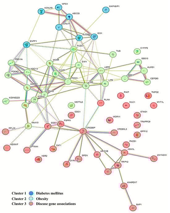 Network illustrating the clustering of protein products of genes associated with diabetes, obesity, and rare syndromes, based on genotype–phenotype correlation databases and using the k-means clustering algorithm in the STRING version 10 software.