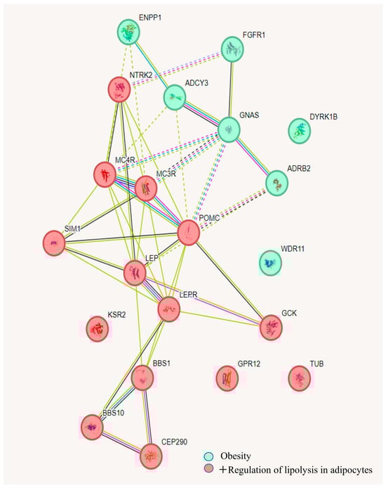 Recessive forms of severe obesity were identified, caused by homozygous or compound heterozygous mutations in the following genes: LEP (leptin), LEPR (leptin receptor), BBS1 and BBS10 (Bardet–Biedl syndrome), and POMC (pro-opiomelanocortin). These genes are well-studied, and their roles in the development of severe obesity in children are well-established. Approximately half of the identified variants had not been previously reported in the literature (Table 1). Heterozygous carriage of recessive mutations was observed in the ADCY3 (adenylate cyclase 3), CEP290 (centrosomal protein), and TUB (Tubby-like protein) genes, which are involved in obesity pathogenesis. However, no second pathogenic variant was detected. Variants were identified in the following genes: MC3R and MC4R (neuronal melanocortin receptors), DYRK1B (dual-specificity tyrosine-phosphorylation-regulated kinase), GPR12 (G-protein-coupled receptor 12), SIM1 (transcription factor), GNAS (stimulatory G-protein alpha subunit), NTRK2 (neurotrophic factor receptor), and KSR2 (kinase suppressor of Ras 2). These variants are associated with dominant forms of obesity in patients with a family history of the condition. Additionally, a previously unreported structural variation, a large deletion on chromosome 15, was identified with approximate boundaries chr15:22786711-28720475 (15q11.2-q13.1), spanning 5,933,764 base pairs. This deletion includes exons 1–5 of the NIPA1 gene and fully encompasses the genes MKRN3, MAGEL2, imprinted genes NDN and SNRPN, and UBE3A, GABRB3, GABRA5, OCA2, and HERC2. Heterozygous deletions in the 15q11.2-q13 region with loss of the paternal copy have been described in Prader–Willi syndrome. A large duplication in a heterozygous state on chromosome 17 was also identified, with approximate boundaries chr17:6819193-7498210, spanning 679,017 base pairs. This duplication includes the genes TEKT1, ALOX12P2, ALOX12-AS1, RNASEK, C17orf49, MIR497HG, MIR195, MIR497, BCL6B, SLC16A13, SLC16A11, CLEC10A, ASGR2, RPL7AP64, ASGR1, DLG4, ACADVL, MIR324, DVL2, PHF23, GABARAP, CTDNEP1, ELP5, CLDN7, RNA, SLC2A4, YBX2, EIF5A, GPS2, NEURL4, ACAP1, KCTD11, TMEM95, TNK1, PLSCR3, TMEM256, NLGN2, SPEM1, SPEM2, SPEM3, TMEM102, FGF11, CHRNB1, ZBTB4, and SLC35G6. Duplications of this region with similar sizes have been described as pathogenic or likely pathogenic in the Decipher database in patients with developmental delays, obesity, short stature, and other phenotypic features. All protein products of the identified genes cluster into two subgroups: one directly involved in the development of obesity, and the other involved in lipolysis regulation in adipocytes (Figure 2).