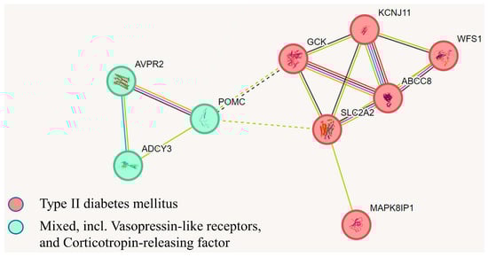 Pathogenic variants were also identified in genes associated with MODY (maturity-onset diabetes of the young), including ABCC8, GCK, KCNJ11, and WFS1. Variants were additionally found in genes linked to nephrogenic diabetes insipidus type 1 (AVPR2), the SLC2A2 gene encoding the GLUT2 protein, which plays a key role in glucose metabolism, and the MAPK8IP1 gene encoding a regulator of pancreatic beta-cell function (Table 4). In one case, a mutation in the ABCC8 gene co-occurred with a pathogenic variant in the POMC gene, while, in another case, a pathogenic variant in the KCNJ11 gene was found alongside a mutation in the ADCY3 gene, which encodes adenylate cyclase type 3, a protein that converts ATP to cAMP and is associated with obesity. It is known that insulin exerts a dominant anabolic effect on adipocytes by reducing the circulating concentrations of various metabolic components, stimulating glucose uptake by tissues, suppressing the release of fatty acids from adipose tissue, inhibiting ketone production in the liver, and promoting fat and glycogen storage. Accordingly, elevated insulin levels are predictably associated with weight gain []. Figure 3 illustrates the clustering of these genes into two subclasses: those associated with type 2 diabetes and those interacting with vasopressin and corticotropin-releasing factor. In the adenohypophysis, vasopressin, together with corticotropin-releasing hormone, stimulates the secretion of adrenocorticotropic hormone (ACTH), which is involved in stimulating lipolysis. This further suggests the involvement of the identified gene variants in the development of obesity in children.