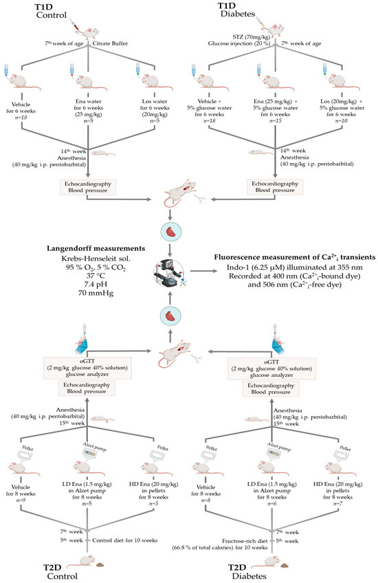 The T1D and T2D animal models and the experimental protocol. Abbreviations: T1D—type 1 diabetes; T2D—type 2 diabetes; STZ—streptozotocin injection; Ena—Enalapril; Los—Losartan; LD Ena—low-dose Enalapril; HD Ena—high-dose Enalapril; oGTT—oral glucose tolerance test.