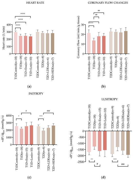 Hemodynamic parameters of isolated hearts in T1D and T2D models. Data of heart rate (a), coronary flow (b), left ventricular inotropy: +dP/dtmax (c), and left ventricular lusitropy: −dP/dtmax (d) in T1D Control (n = 18), T1D (n = 18), T1D + Ena (n = 15) and T1D + Los (n = 10), T2D Control (n = 9), T2D (n = 8), T2D + LD Ena (n = 6) and T2D + HD Ena (n = 7) groups. Statistics: one-way ANOVA and Tukey’s multiple comparison post hoc test; *: p < 0.05, **: p < 0.01, ***: p < 0.001, ****: p < 0.0001 vs. T1D Control or T2D Control values, #: p < 0.05, ##: p < 0.01, ###: p < 0.001 vs. values in diabetic (T1D or T2D) groups. (Mean ± SD). Abbreviations: T1D—type 1 diabetes, T2D—type 2 diabetes, +dP/dtmax—left ventricular inotropy, −dP/dtmax—left ventricular lusitropy, Ena—Enalapril, Los—Losartan, LD Ena—low-dose Enalapril, HD Ena—high-dose Enalapril.