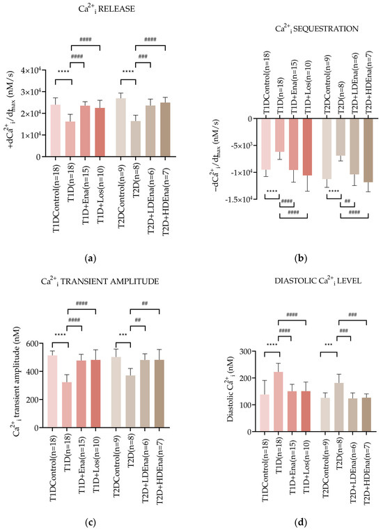 Figure 4b displays −dCa2+i/dtmax data, which represents the dynamics of Ca2+i sequestration by SERCA2a back to the SR of the cardiomyocytes in isolated, perfused hearts. In T1D, the maximum rate of Ca2+i removal slowed down by almost 35% compared to Control (−6193 ± 1415 vs. −9511 ± 1270 mM/s, respectively; p < 0.0001). However, Enalapril and Losartan treatments normalized these changes (T1D + Ena and T1D + Los groups). In T2D, the Ca2+i sequestration also deteriorated (T2D: −6905 ± 975 vs. Control: −11,259 ± 1534 mM/s; p < 0.0001), however both LD and HD Enalapril treatments could restore the dynamics of Ca2+i removal in T2D (T2D + LD Ena and T2D + HD Ena groups, Figure 4b).