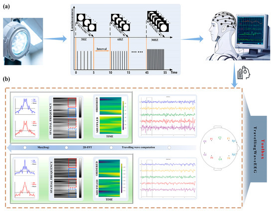 Pipeline of EEG signal acquisition and traveling wave feature extraction. (a) Collecting the EEGs of participants at photic stimulus of different frequencies and performing manual preprocessing operations. (b) Use of the Travelling-waves-EEG toolbox to extract the propagation intensity of forward and backward waves in the left and right hemispheres from the preprocessed EEG.