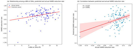 Scatter plot of the correlation between actual and predicted values of HAMD reduction rate based on α-BW at 10 Hz IPS. (a) Blue points indicate actual HAMD reduction rates, and the red line represents predictions based on α-BW at 10 Hz IPS. (b) Correlation between actual and predicted HAMD reduction rates (R = 0.327, p < 0.01), with the red regression line indicating the linear relationship. The red shaded area represents the 95% confidence interval of the regression, and the blue dots represent individual data points.