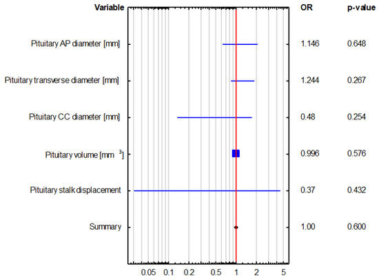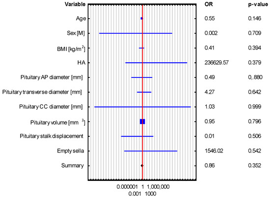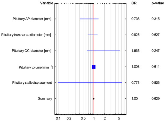 Statistical analysis was conducted with Statistica® software (13.3). Statistical significance was determined with the use of inference tests suitable for the nature and the type of data, i.e., their distribution (verified with the Shapiro–Wilk W test) and variance homogeneity (verified with the Brown–Forsythe’s test). Continuous variables were presented as means ±SD, and the comparisons were made using either the Student’s t-test for normally distributed variables with homogeneous variances or the Mann–Whitney U test for dependent variables showing departures from either normal distribution or variance homogeneity. Nominal variables were presented as absolute numbers and percentages and compared using either the chi-square test or the exact Fisher’s test. Spearman’s rank correlation test was used to assess correlations between the pituitary volume and pituitary CC, transverse, and AP diameters. The univariate and multivariate logistic regression model was used to determine the statistical significance of the evaluated variables in predicting hormonal disorders (adrenocortical insufficiency and hyperprolactinemia). Regression results were presented as odds ratio (OR) with a 95% confidence interval (95% CI). In order to minimize the possibility that some outcomes may have been recorded by pure chance due to the low sample sizes of both groups and, additionally, the fact that the diagnosis was incidental, we validated the estimates with the use of resampling techniques. For this purpose, we employed bootstrap-boosted logistic regression analyses (10,000 iterations) using the original sample sizes. p-values below 0.05 were considered statistically significant.