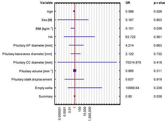Univariate logistic regression revealed that pituitary gland dimensions and volume were not significant predictors of hormonal disorders, such as adrenocortical insufficiency and hyperprolactinemia, as shown in Table 4 and Figure 4 and Figure 5. This observation was further confirmed by bootstrap-boosted multivariate logistic regression, adjusted for age, sex, BMI, and hypertension, as shown in Table 5 and Figure 6 and Figure 7. The analysis revealed that age and BMI increase the risk of hyperprolactinemia.